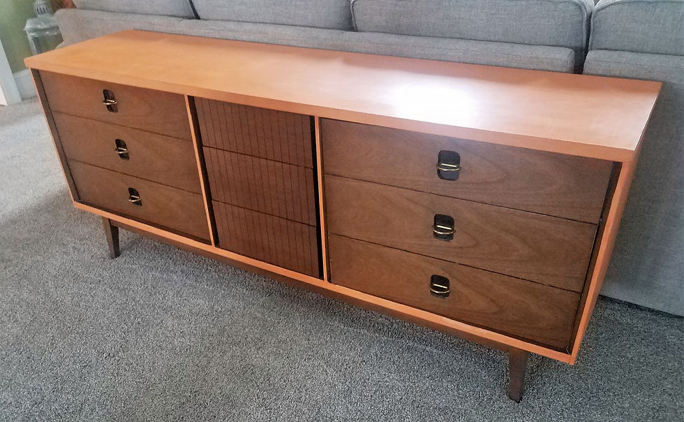 This piece started as a dresser with all drawers. We removed the three drawers from each end and repurposed the fronts by attaching them to a wooden panel to form a door. When closed, it retains the appearance of drawers. It's painted orange, while the drawer fronts maintain their original finish, making it an ideal game cabinet.