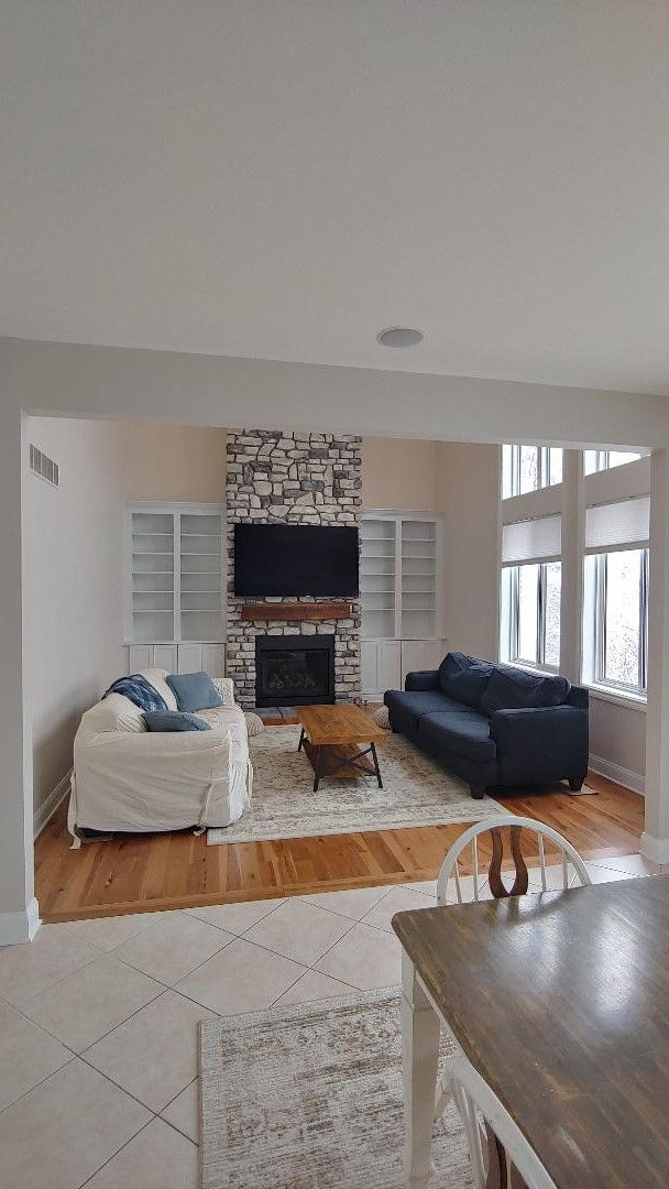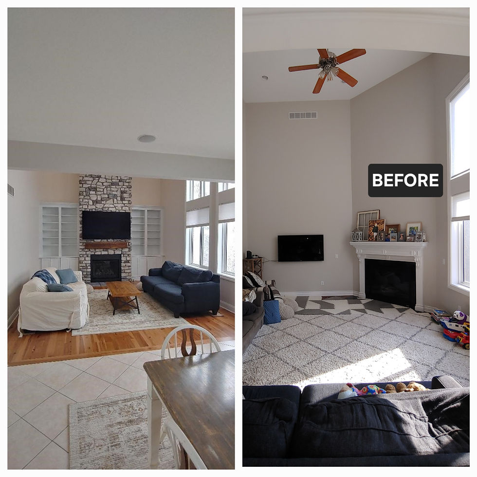 Sometimes, a before-and-after comparison is essential to grasp the changes made. In this project, we removed the original fireplace due to its awkward angle. We then installed a new fireplace, along with a stone and wood mantle, custom cabinetry, and wood flooring. The result is a much-improved flow for the space.